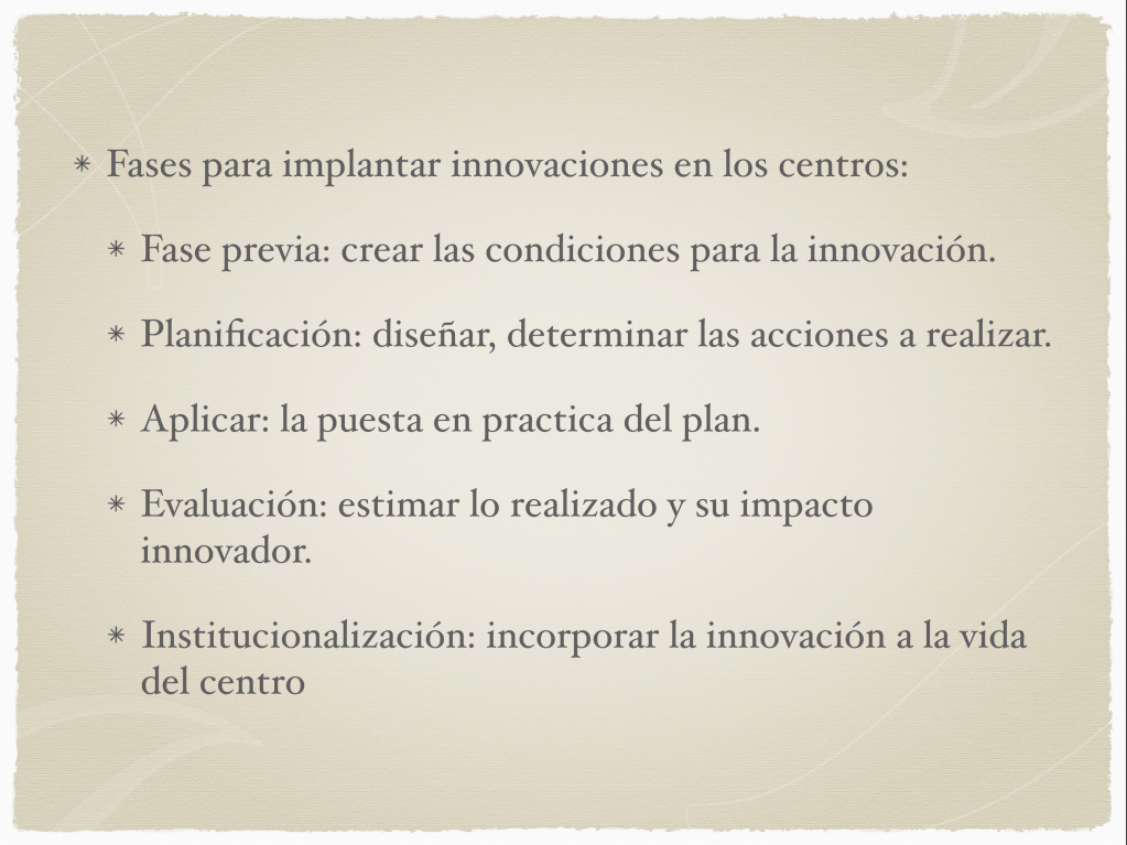 Si se lleva a cabo una innovación en los procesos de E-A, se estarán introduciendo nuevas formas de entender y de hacer, lo que supone nuevos métodos de enseñanza, nuevas estrategias, nuevos modelos de actividades y una nueva utilización de recursos didácticos.